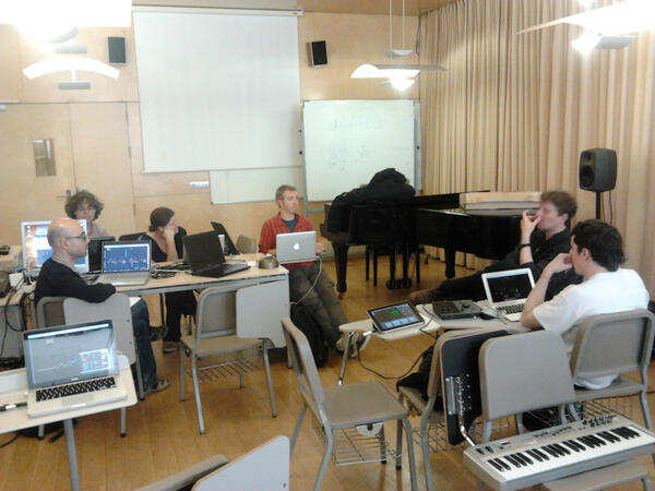 After that, we performed a new work in progress, Quo-tr, which was specially created for us by composer Orm Finnendahl, with support from the Barcelona branch of the Goethe Institut (we will perform this piece again this Friday, April 26, as part of the Mixtur festival). In it, five performers make real-world sounds (in my case, using Tibetan bowls, marbles, velcro, paper, a bird chirper, and more), which are incorporated and “quoted back” by a graphical score, controlled by elaborate Pd patches created by Orm.