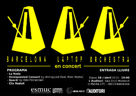 Last week was a busy one! After Tuesday’s Moritz/Insectotròpics event, on Thursday I had another concert with the Barcelona Laptop Orchestra – this time at l'Auditori, in Sala 2 (Oriol Martorell). There wasn’t enough advance publicity, and we ended up very (very!) far from filling the 600-seat venue, but it was a great experience nonetheless. It was fun to be behind the scenes at such a large and professionally-run venue. It reminded me of my Banff Centre days.