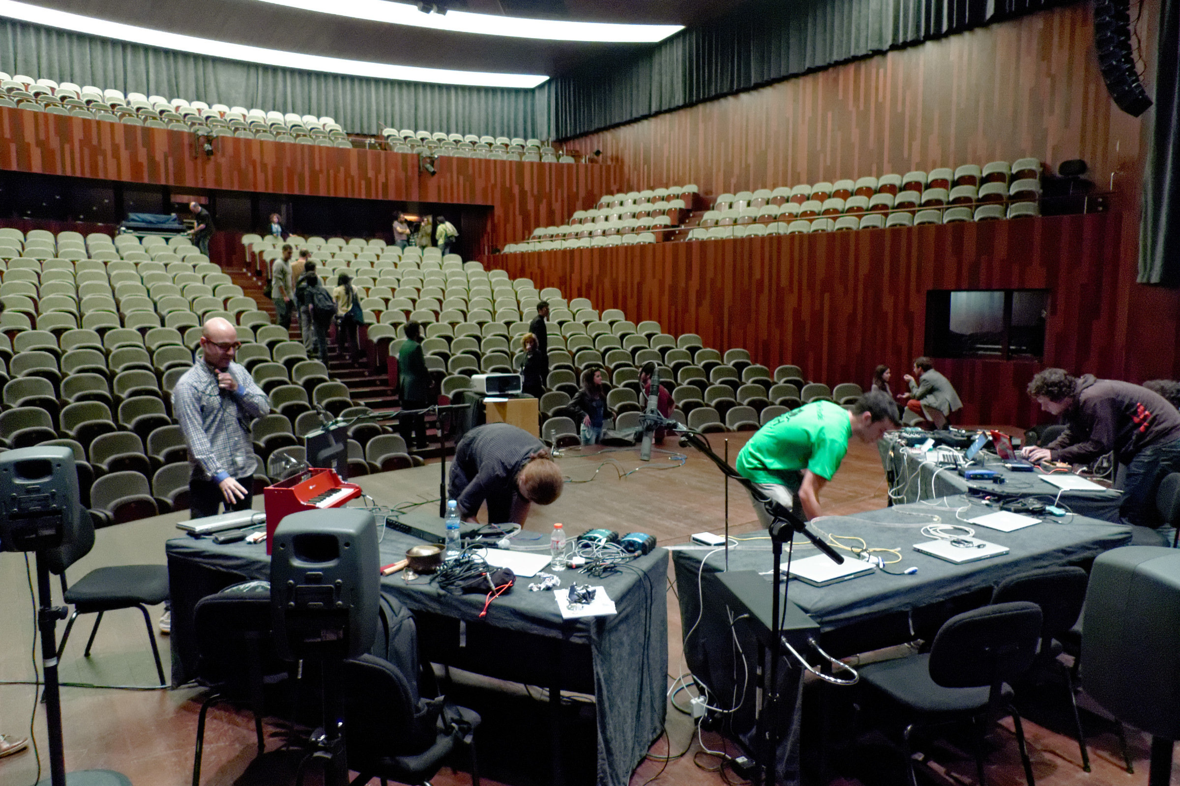 Barcelona Laptop Orchestra members packing up in Auditori’s Sala 2, after the show on April 18, 2013.