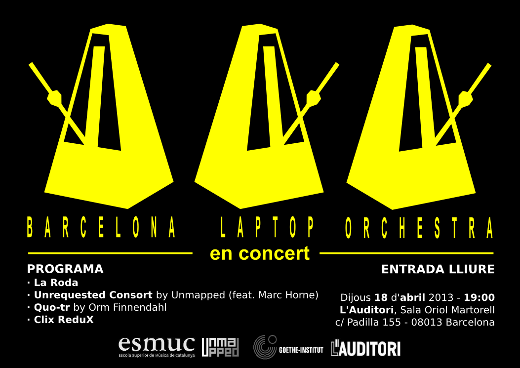 Last week was a busy one! After Tuesday’s Moritz/Insectotròpics event, on Thursday I had another concert with the Barcelona Laptop Orchestra – this time at l'Auditori, in Sala 2 (Oriol Martorell). There wasn’t enough advance publicity, and we ended up very (very!) far from filling the 600-seat venue, but it was a great experience nonetheless. It was fun to be behind the scenes at such a large and professionally-run venue. It reminded me of my Banff Centre days.