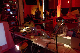 One thing we missed was interaction with the other video groups and painters – we’d hoped to send our outputs to others for further manipulation, as well as receiving their feeds (and hand-made imagery or even photo print-outs) to use as source material. Hopefully in subsequent events this can happen – in the end we mostly kept to our own little corner (of hell). As often happens, everyone was really busy getting their own things ready until the last moment, and there wasn’t time to plan for more dynamic interaction between groups, as everyone had hoped.