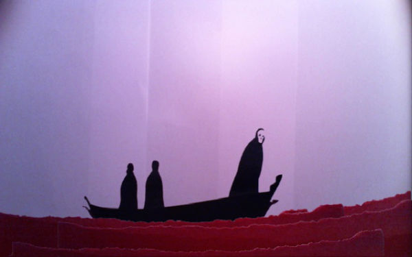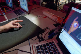 A second Teatrillu program received input from the first (over the local network, using [TCPSyphon](http://techlife.sg/TCPSyphon/)), and then manipulated it with further effects. Alex experimented with projecting "my" world onto the pages of a book, at other times masking it with hand-drawn (or infrared-projected) shapes on a whiteboard, at others still adding little flames to all its shapes.