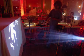 One of our setups consisted in a “traditional” Teatrillu, making live stop-motions and other animated effects under a webcam, based on hand-made drawings and cutouts. The output of these minimalist animations was fed to a TV on the Insectos' video wall, as well as to a makeshift viewer we made out of an old wooden drawer, a tablet, a macro lens and some cardboard and aluminum foil.