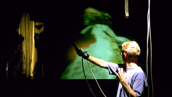 The projects presented were as diverse as the artists involved. Each project featured real-time virtual environments and sound, but not all chose to use the headset display and hand interactions of “traditional VR”. The projects used various permutations of the following technologies: IrisGL (later OpenGL) and SGI Performer for graphics generation; head-mounted displays; magnetic (Polhemus), ultrasonic and multi-camera tracking of bodies and objects in 3D space; the University of Alberta’s “Minimal Reality Toolkit” for VR tracker and device management; stereoscopic and large-screen projection; prerecorded LaserDisc content programmatically triggered and mixed with real-time graphics; binaural audio; a VPL DataGlove for hand interaction; novel user interfaces (such as a “surfing platform” or pinchable “grippees”); real-time voice recognition and processing; digital mixers, audio synthesizers and samplers. And lots of custom software, written mostly in C, but also in Max (then from Opcode; now from Cycling ‘74) and other languages.